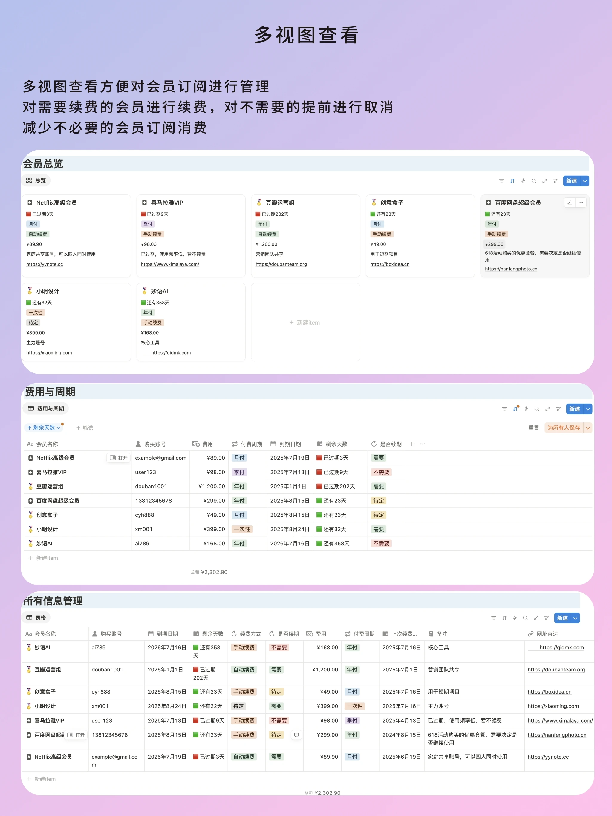 一屏查看所有订阅的到期剩余天数、价格、续费方式等关键信息